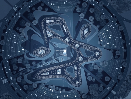 Основными зонами силуэтного обзора проектируемого участка являются пересечение Белгородской Объездной Дороги / ул. Чичерина и Кашарского проезда. Участок граничит непосредственно с ЖК "Жемчужина" на юго-западе и ЖК "Новая жизнь" на северо-востоке, а также стадионом на юго-востоке. Территория "Белгород сити" является транзитной между этими жилыми комплексами, что создает предпосылки для хорошего пешеходного трафика, а значит, делает проект экономически целесообразным. За основную визуальную ось была принята диагональная аллея-променад, связывающая "Белгород сити" с ЖК "Жемчужина". Заданное в условиях конкурса круговое движение (с радиусом 188 м) оптимально вписывается в участок застройки, поэтому было решено оставить предложенную круговую организацию транспортных потоков. Безсветофорное магистральное движение по Белгородской Объездной Дороге обеспечивается засчет увода ее в подземный тоннель. Определенные сложности возникают с выездом с кольца на территорию комплекса. В данном случае мы рассматриваем кольцо как городскую улицу с односторонним движением и разрешенной скоростью до 50 км/ч, поэтому считаем возможным организацию четырех левоповоротных въездов на территорию сити. При этом въезды были разведены с выездами на расстояния от 120 м друг от друга. Кроме аллеи-променада создаются еще три пешеходных луча, связывающие окружающие районы и ведущие в центр сити. В местах пересечения этих лучей с кольцом устраиваются кнопочные светофоры. Между четырьмя пешеходными лучами устраиваются парковки по радиально-лучевому принципу. Автомобильные парковки являются частью ландшафта и запроектированы максимально тактично, чтобы не нарушать общий бионический рисунок комплекса. Центр сити - главная площадь комплекса "Урбан-плаза".