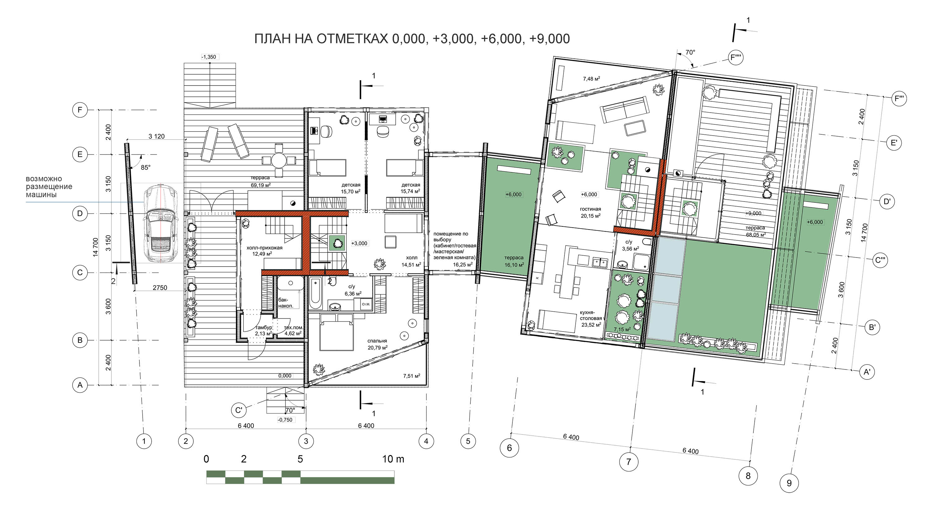 Проект блокированного жилого дома отвечает современным “зеленым” стандартам и гармонично вписывается в среду. За основу взят образ и характеристики живого дерева, дом создан на его подобии. Воздействие на существующую экосистему оказывается минимальным за счет приподнятости структуры и основного объема над землей на деревянных стойках (фундамент - столбчатый, конструкции - деревянный каркас).
