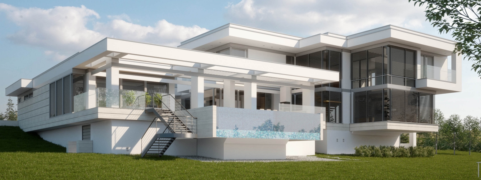 Отделка фасада здания выполнена с использованием современных кварцевых плит, которые прослужат многие годы без изменений своего внешнего вида. Большой остекленный бассейн добавляет уникальности этому проекту.