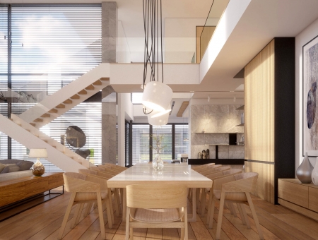 На первом этаже традиционно расположена дневная часть дома. Большая гостиная со столовой и кабинет находятся в левой части дома. Невозможно пройти мимо большой кухни, расположенной в центральной части, которая вместе с внутренним зеленым двориком создают «сердце» этого дома. В правой части здания расположены отдельные апартаменты для старшего поколения семьи. Зону отдыха составляют крытый бассейн, сауна и большая терраса с выходом на второй открытый бассейн.