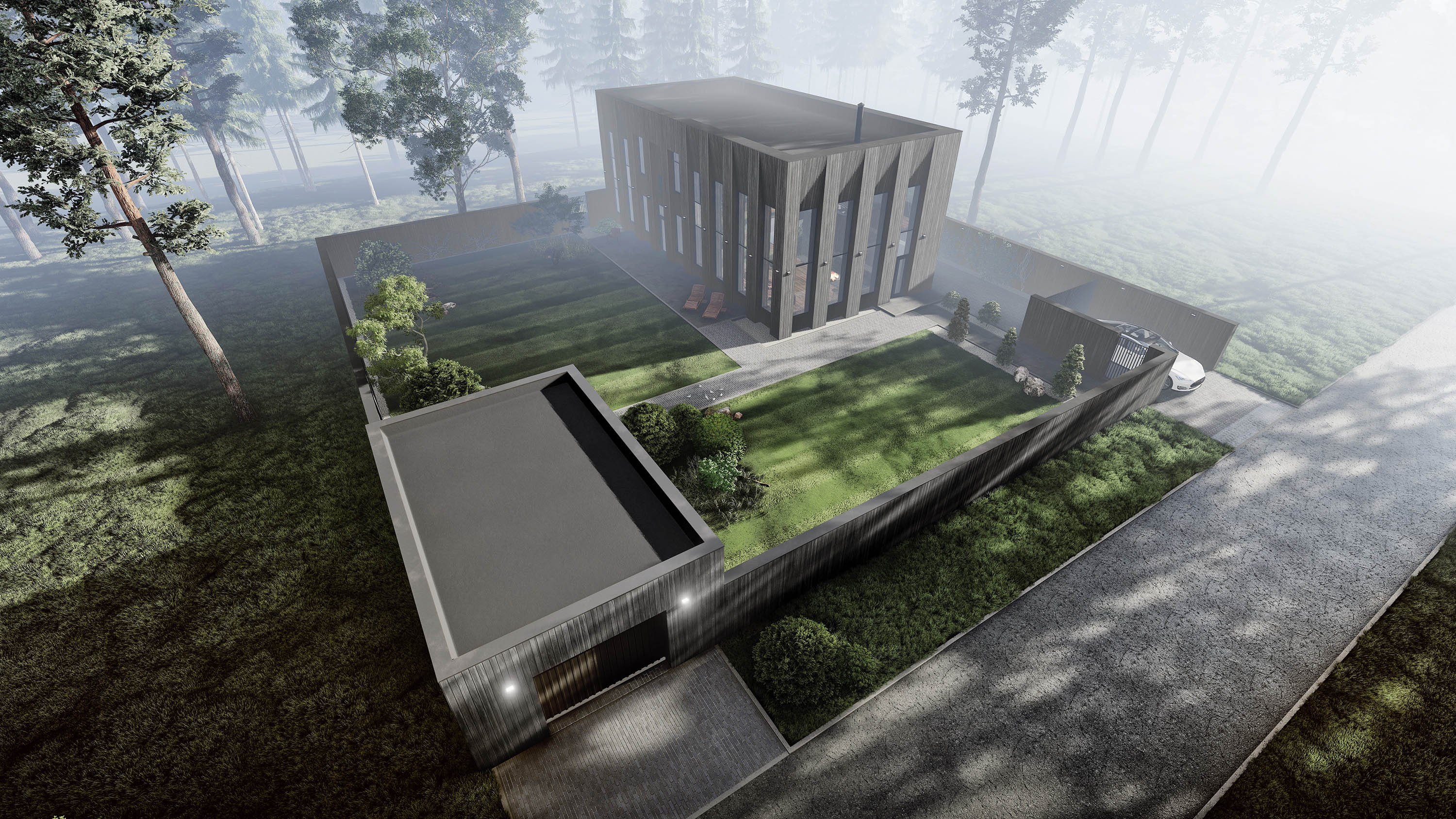 Индивидуальный жилой дом спроектирован по заказу частного лица в коттеджном поселке «Горки Академпарка». Для архитектуры здания характерно подчеркнуто сдержанное минималистичное решение как в части пластических решений, так и в применяемых материалах отделки.