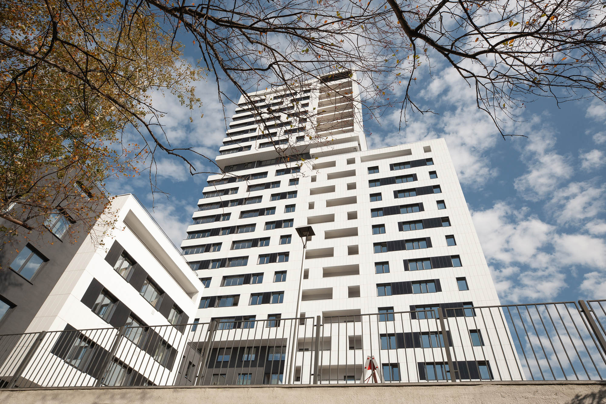 Необычная и смелая композиция для жилого дома построена на чистом пропорционировании объемов и консольных выносах этажей, создающих активную объемную пластику. Все это придает зданию подчеркнуто концептуальный характер. Жилой комплекс стал одной из ярких градостроительных доминант в центре города.