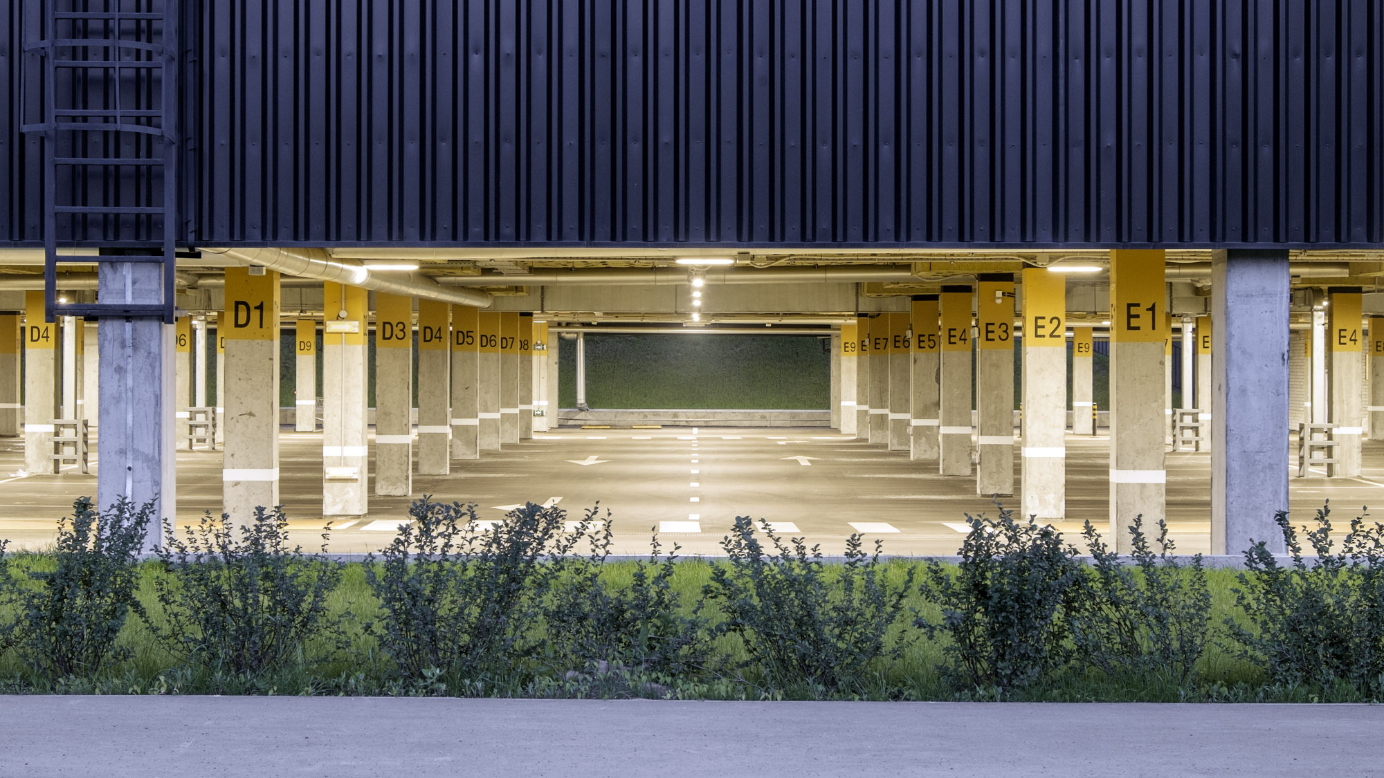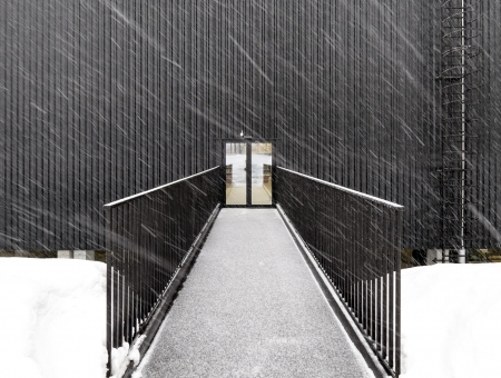 Чёрные фасады с фактурой, похожей на вельвет, и остекление джамбо-формата служат фоном для снега и зелени. Главный вход выделен геометрической формой и подчёркнут отделкой брусками с текстурой тёмного дерева.