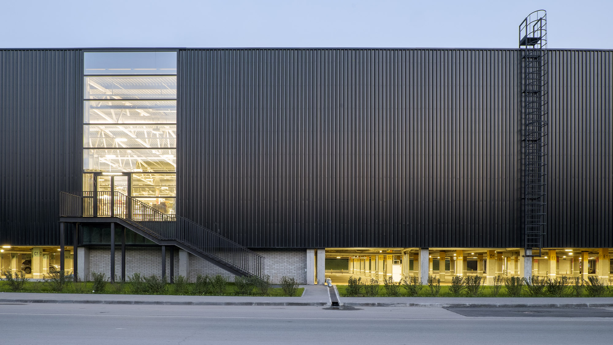 Здание магазина размещено на участке с перепадом высотой в этаж. Такой рельеф позволил разместить открытую автостоянку под зданием и исключить пересечение пешеходов и автомобилей на подходе к зданию. Четверть земельного участка занята пешеходным мощением и озеленением.