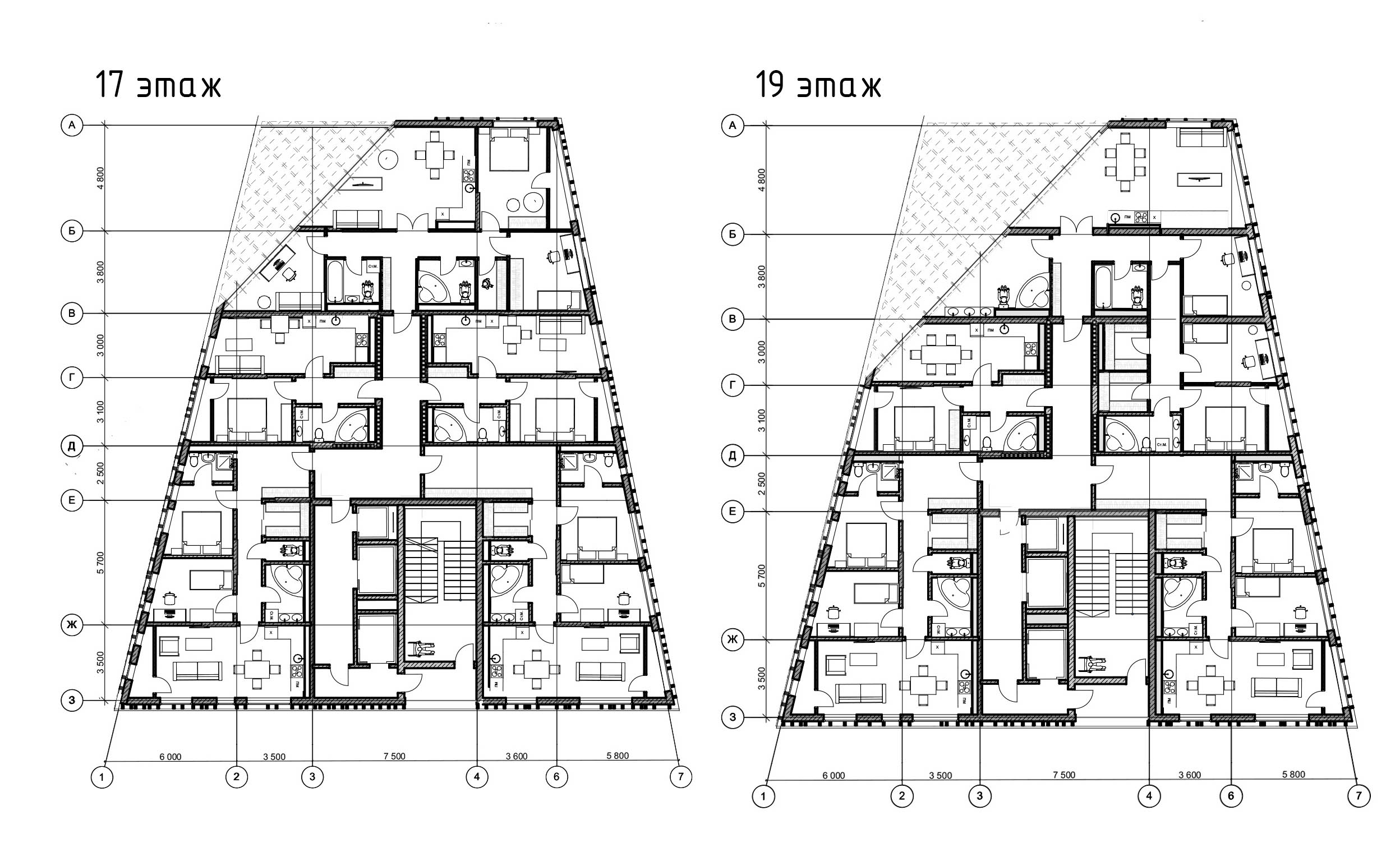 существующих жилых зданий. Архитектурно-планировочное решение жилого дома выполнено в соответствии с заданной этажностью и номенклатурой квартир. Здание состоит из 20 этажей, типовой этаж с 3-12, состоит из пяти квартир: 4,5; две 1,5; две 2,5. На 18-19 этажах по четыре квартиры: 3,5; две 1,5; две 2,5. Габариты квартир приближены к