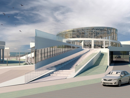 Запроектирована эксплуатируемая кровля с монолитным покрытием толщиной 500 мм, плоская в западной части и в виде пандусов в восточной части. Парапеты высотой 600мм. Крыша центральной части стеклянная – подогреваемая.