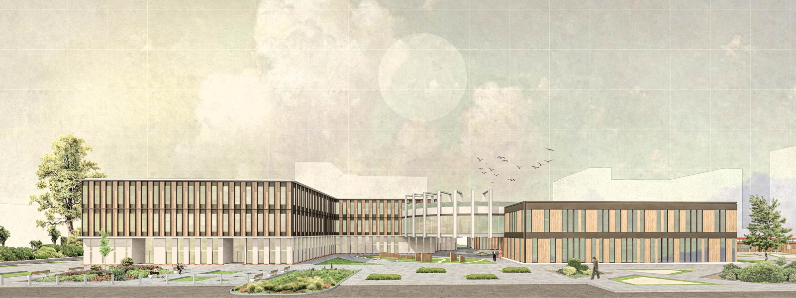 Проектом предлагается создать школу, состоящую из нескольких блоков разного назначения. Сами корпуса соединяются между собой кольцом – символом круговорота в природе, единства, законченности. Школа была спроектирована на основе модульной сетки, которая сформировала гармоничность композиции. Прямоугольник в плане собирает образ в одну законченную фигуру. Сами стороны прямоульника в основе школы подчиняются золотому сечению. Решение фасадов – простой, но лаконичный ритм глухих и остеклённых поверхностей. Корпус учебный и спортивный отличаются между собой по решению фасадов, но при этом гармонируют друг с другом. Большие окна в классах гарантируют максимум солнечного света. Шумопоглощающие материалы, использованные в отделке, обеспечивают тишину.