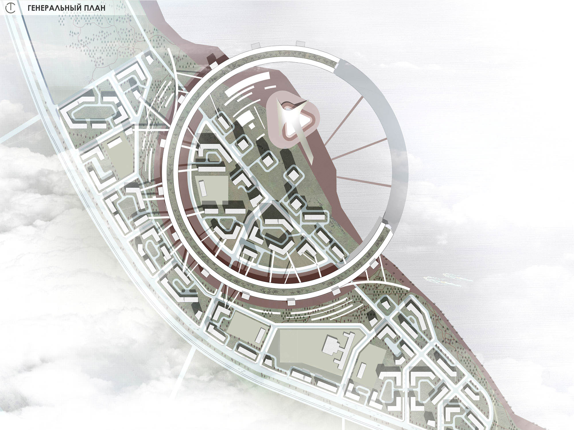 Аналогично проходит зеленая полоса, обвивающая канал и выходящая за пределы центра, что делает наиболее доступным местом отдыха для жителей. Двигаясь в центр, можно ощутить расслоение стихий: застройка, районный парк, водный канал, стилобат, нависающий над ним, и центральная высотная застройка. Также стилобат является объединяющим элементом воды, земли и воздуха.