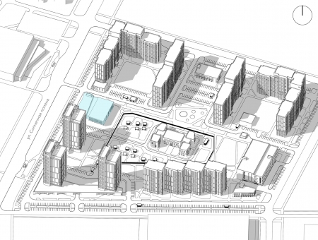 Здание в плане простой прямоугольной формы c размерами в осях 41,0 х 46,2 м. и переменной этажностью (2-3 этажа) с частично эксплуатируемой кровлей. Главный вход для посетителей расположен с западной стороны и ориентирован на ул. Солнечная поляна. Вход на первый этаж осуществляется с уровня земли, тем самым обеспечивается доступ в здание МГН.