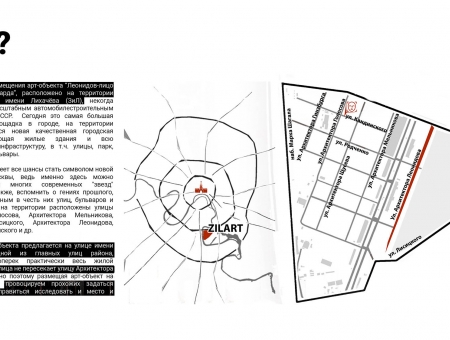 Размещение объекта предлагается на улице имени Кандинского, одной из главных улиц района, разрезающий поперек практически весь жилой квартал. Данная улица не пересекает улицу Архитектора Леонидова. Именно поэтому, размещая арт-объект на этом месте, мы провоцируем прохожих задаться вопросами и отправиться исследовать и место, и историю.