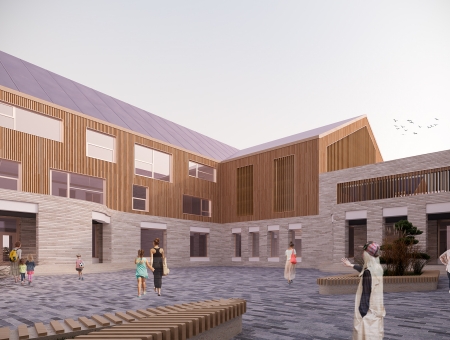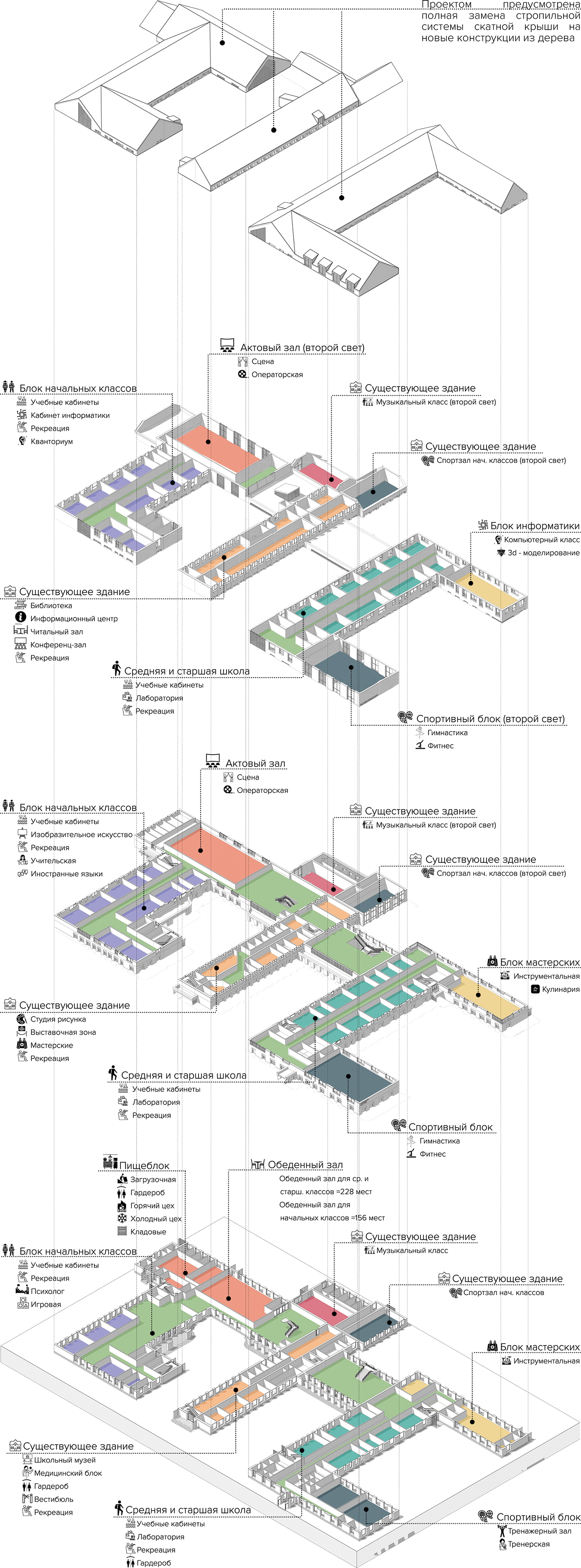 В существующем здании школы будут размещены: медицинский блок, спортивный зал начальной школы, блок иностранных языков, помещения дополнительного образования, творческие мастерские, библиотека и информационный центр, административно-хозяйственные помещения, конференц-зал.