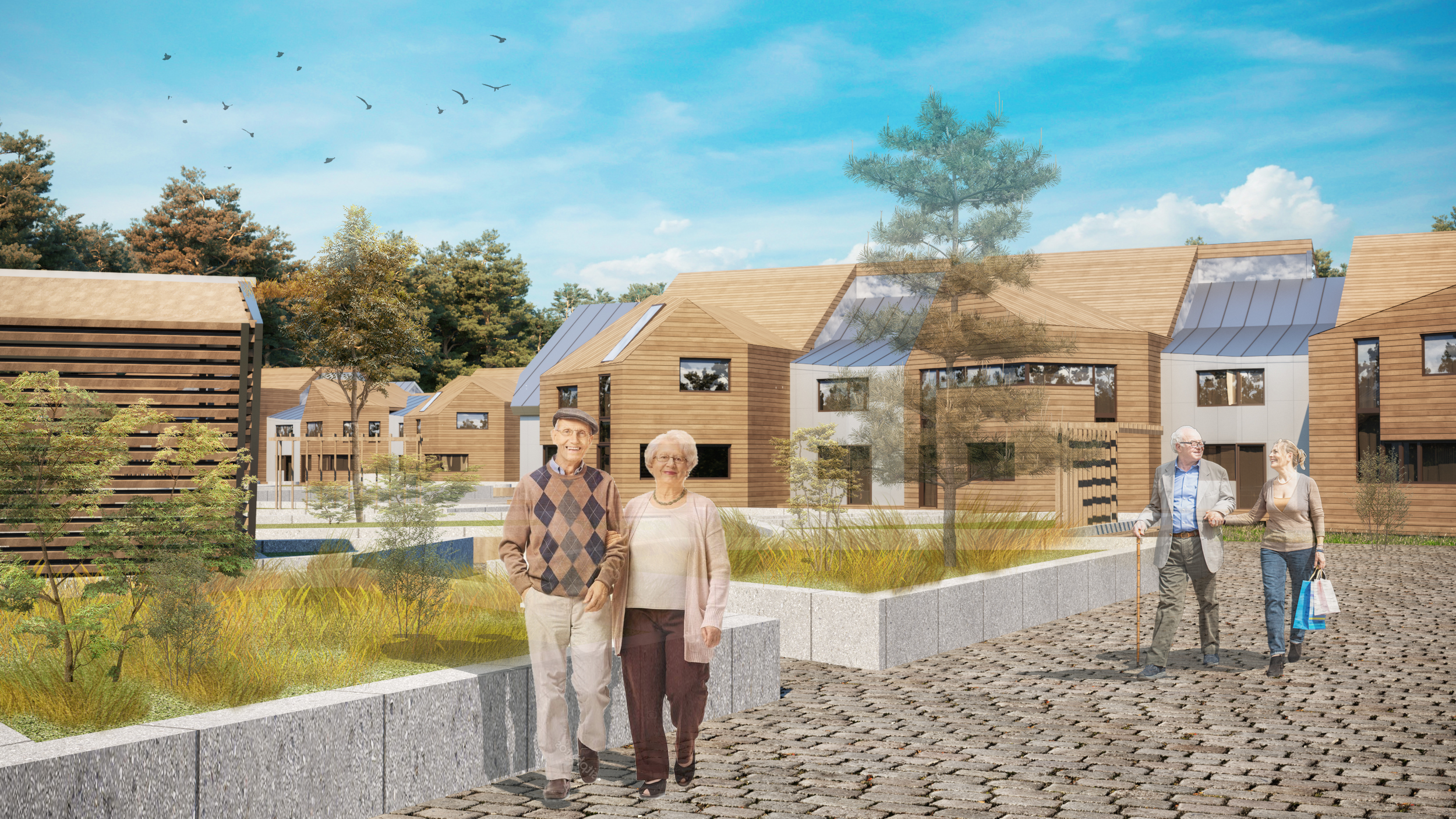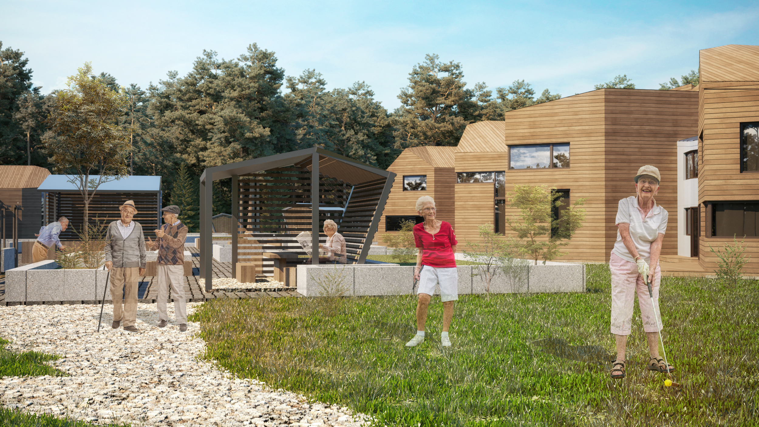 Концепция пансионата для пожилых выполнена на условном участке площадью 7 га в Московской области. Проектом предусмотрено создание комфортной среды, способствующей отдыху и оздоровлению в гармонии с природой в атмосфере, приближенной к домашней. При въезде на территорию располагается административный корпус, включающий в себя блок медицинских помещений, зону водолечения в бассейне, спа, массажные кабинеты и оборудованные тренажерные залы для лечебной физкультуры. Также в корпусе расположены пищеблок и необходимые технические помещения.