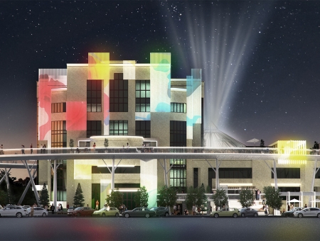 Проектируемый участок распланирован таким образом, что вокруг здания располагаются площадки с различной функциональной направленностью. Создаётся система открытых, интегрированных друг в друга, общественных пространств, фактически стирающих границу между собственно зданием и благоустроенным ландшафтом вокруг него. Развитие идёт как по горизонтали, так и по вертикали, создавая комплексное объёмно-пространственное решение для различных планировочных уровней общественного пространства.