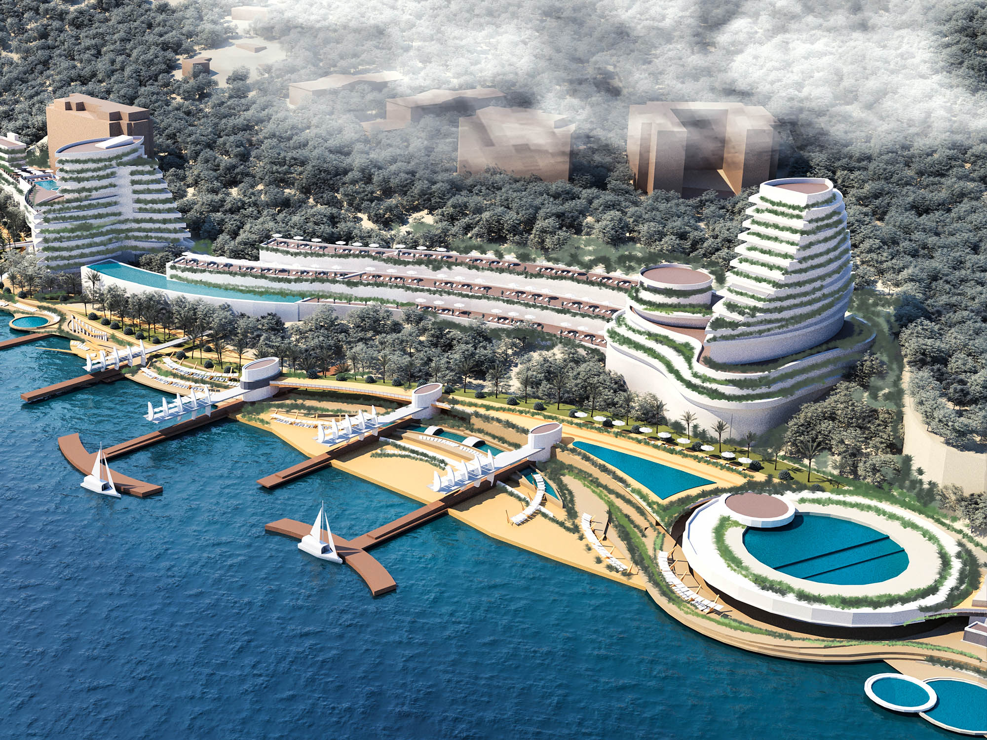 Укрепленные волнорезы защищают новую береговую линию и формируют искусственные заливы для плавания и швартовки малых судов.