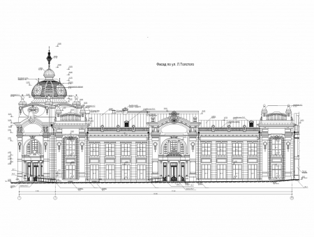 Наиболее богато декорирован срезанный угол объёма, где расположен главный вход. Двухъярусная композиция среза угла здания включает четырёхколонный заглубленный портик, завершённый над антаблементом пологой аркой трёхчастного окна на ковровом заполнении (объёмный растительный орнамент) поле стены.