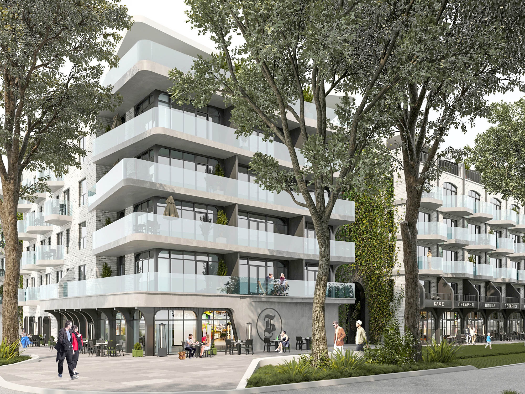 Вдоль ул. Верещагина на первом уровне планируется общественная зона с устройством пешеходного тротуара, зоны озеленения. На 1вых этажах по ул. Верещагина размещена общественная функция: кафе, рестораны, магазины, услуги. Внутреннее пространство решено по принципу двор без машин и включает в себя обширную зону озеленения с размещением там пространств общественного пользования: детских площадок и зон отдыха. По проезду Балтийский размещены помещения оздоровительного центра многопрофильного направления. Проект предполагает размещение подземного паркинга.
