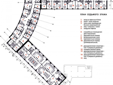 Согласно проекту реконструкции, в радиусной части здания будет расположена гостиница. Левое крыло корпуса (по улице М.Горького) реконструируется под семиэтажный жилой дом с административными помещениями. Правое крыло корпуса (по Октябрьской магистрали) займут офисы. Проект выполнен на основе существующего здания с учетом сложившейся городской застройки и реальных ограничивающих факторов. Поэтому при разработке проекта предпринята попытка гармонично вписать новую архитектуру в сложившуюся историческую среду центра города.