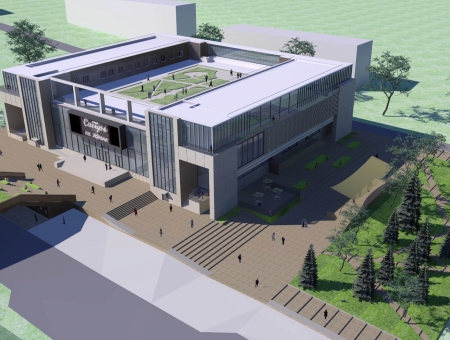 Устройство «моста» в парадной зоне организует связь между жилой территорией северной части Академгородка и является искусственным продолжением существующего ландшафта с прямым выходом к входной группе ДК. Экран на главном фасаде (22х5м) это дополнительное средство вовлечения жителей Академгородка в общественное времяпровождение и очевидная развлекательно-просветительская функция. Под мостом появляется возможность устраивать выставки уличных художников и книжные развалы, для этих целей также можно также использовать фасадные «карманы» в левой и правой частях здания.