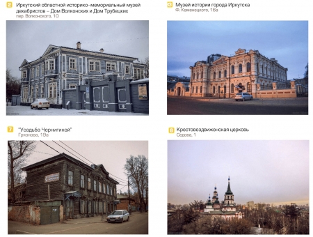 Туристический маршрут, захватывающий наиболее интересные и значимые памятники и места города, стал одним из итогов Летней Мастерской. Проанализировав все предложения участников мастерской, мы составили его таким образом, чтобы показать не только уникальную деревянную архитектуру Иркутска, но и сам город в ее контексте. Маршрут проходит через 5 наиболее значимых “деревянных кварталов” : 1 “Декабристские кварталы” - дома-музеи Волконских и Трубецких и прилегающие усадьбы; 2“Желябовский комплекс” - Идинская сторона, - улица Желябова и прилегающие кварталы; 3 “Ланинские кварталы”; 4“Солдатская слобода” - улицы, когда-то носившие название Солдатских - с 2-й по 5-ю; 5 “Иркутская слобода” - 130-й квартал.