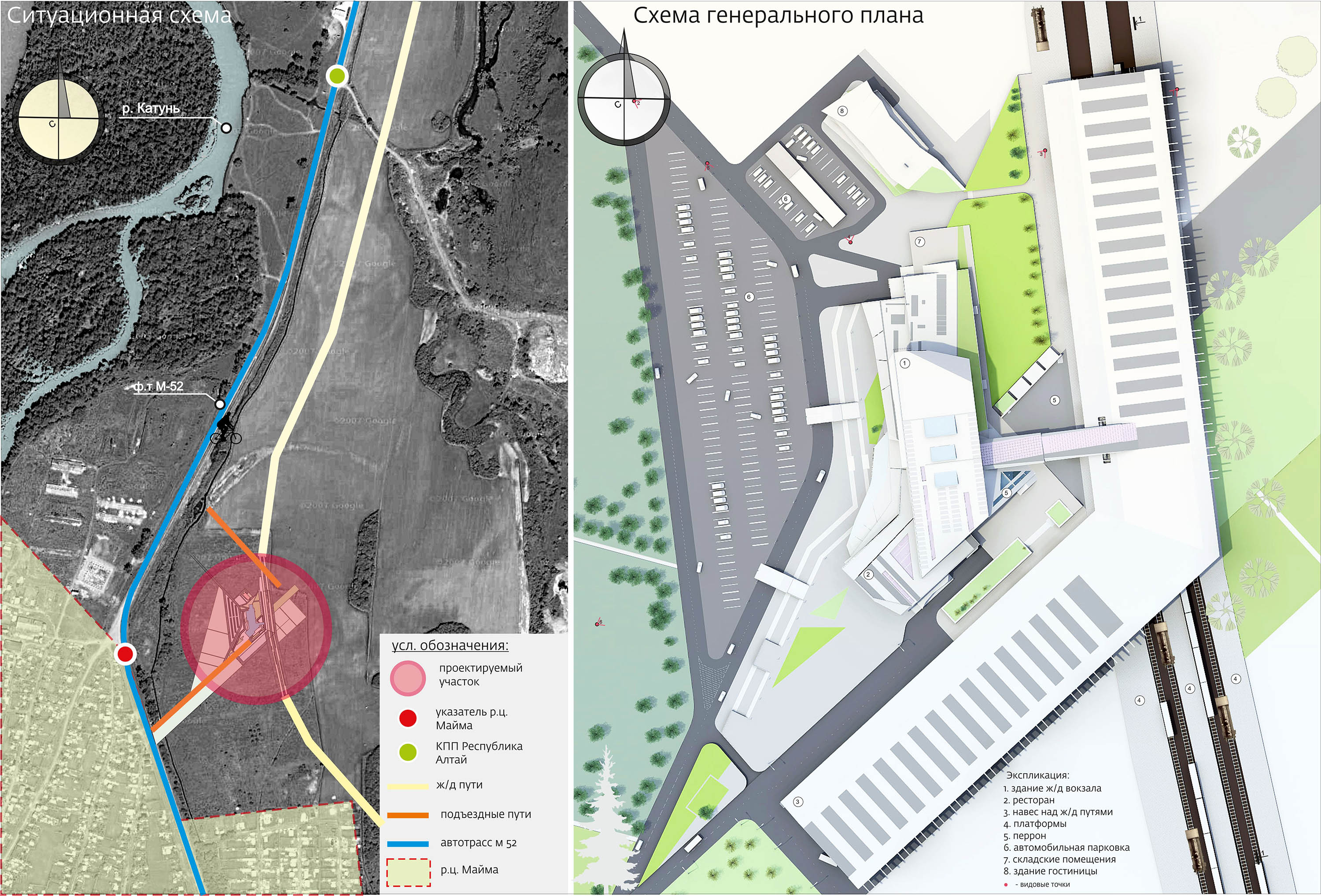 Участок проектирования располагается на въезде в р.ц. Майма, в полукилометре от Чуйского тракта, где присутствует спокойный рельеф, без значительных перепадов, что удобно для проектирования. На территории вокзала предусмотрены дороги, проезды, складские сооружения, прогулочные зоны для посетителей.