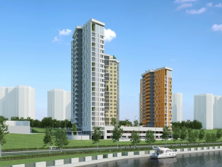 Основным акцентом комплекса со стороны набережной является 23-этажная секция А. За счет компактности в плане, каждый дом выглядит изящно при достаточной высоте относительно городской среды. При рассмотрении с любого угла со стороны водоема дома, за счет формы, размещения и отражения в водной глади не сливаются в одну массивную «стену».