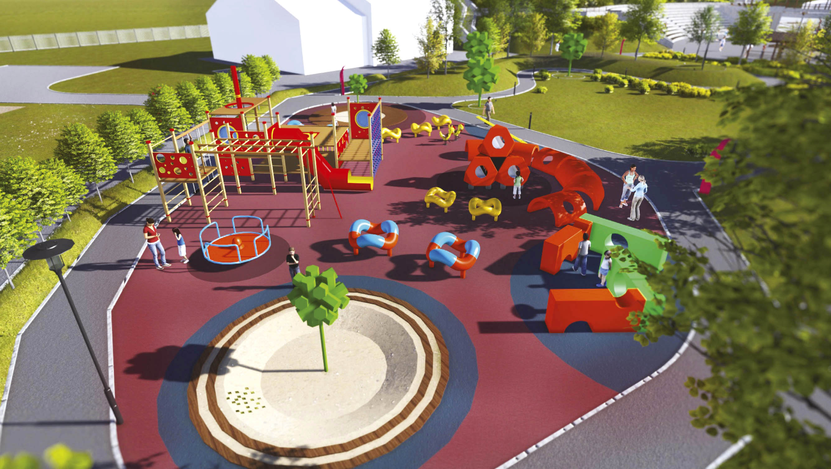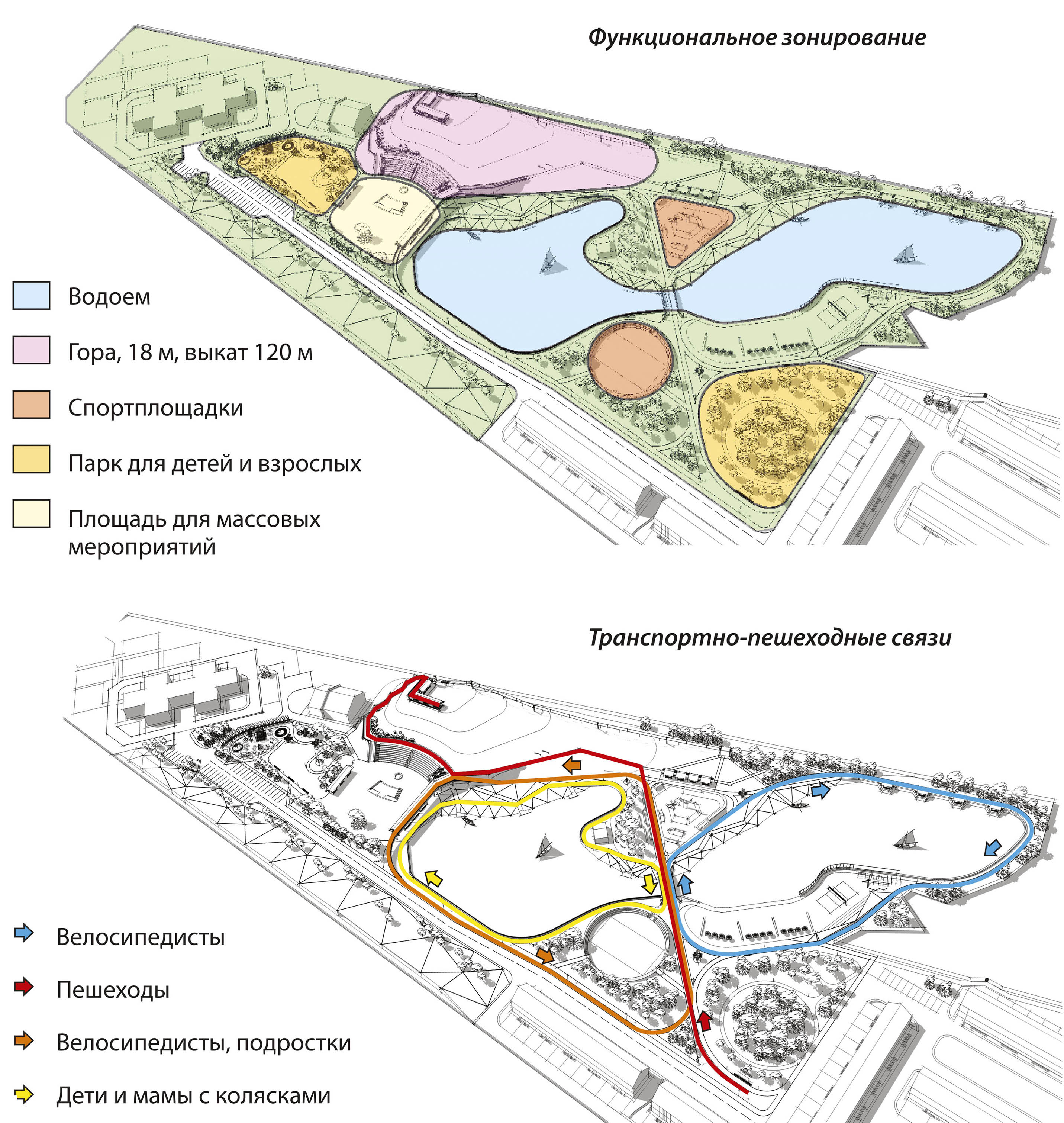 Комфортное пребывание всех посетителей парка достигается за счет разделения в двух уровнях пешеходных и транспортных потоков с помощью универсальной лыже-велосипедной эстакады на площади.