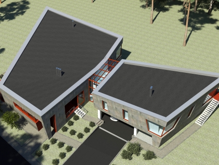 Проект одноэтажного частного коттеджа в живописном пригороде. "Интерактивная" геометрия дома является архитектурной реакцией на сложную геометрию участка. Динамичная и несколько агрессивная композиция состоит из трех основных объемных элементов: общественной зоны, релакс-зоны и собственно жилого блока. Применение приемов обратной перспективы и открытых остекленных углов всех основных помещений дома создает неожиданные визуальные связи между внутренней и внешней окружающей средой.