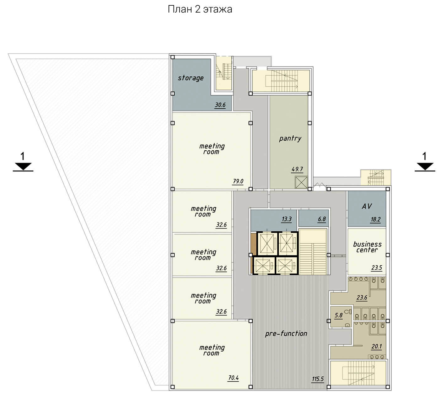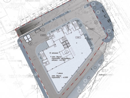 Двенадцатиэтажное здание представляет собой одноуровневый объем. В плане комплекса - два прямоугольника, соединенные лестнично-лифтовым холлом. Встроенный двухэтажный блок на 1-ом и 2-ом этажах отведен для помещений общественного назначения. Компоновка комплекса выполнена с учетом основных точек восприятия здания со стороны торгово-деловой зоны, что выделяет комплекс с точки зрения рекламы и гармонично интегрирует его в общую городскую среду. В решениях фасадов использованы характерные для современной архитектуры композитные материалы в сочетании с витражными навесными системами и стеклом.