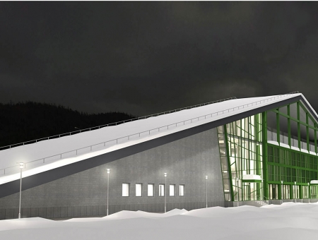 Центральная часть здания – трехэтажный корпус гостиницы с плоской используемой кровлей и дополнительной крышей – навесом. Крыша – навес также может быть эксплуатируемой (например, в качестве лыжной трассы или для экстремальных видов спорта).