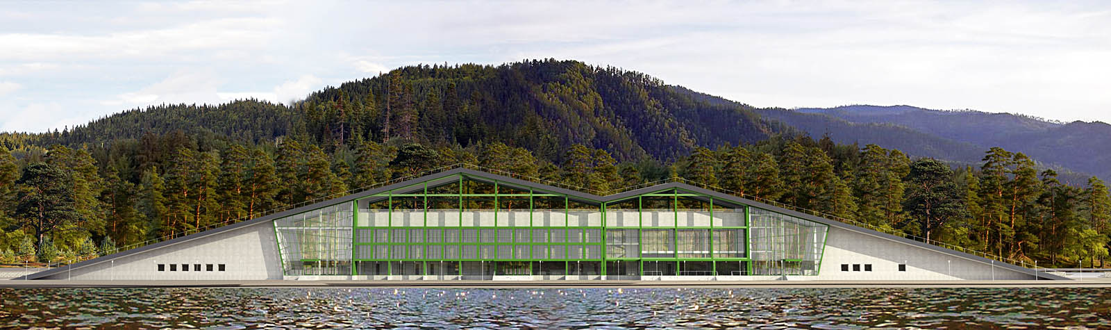 Основная архитектурная идея комплекса – контекстуальный, вписывающийся в окружающую панораму, профиль вытянутого здания. Две скатные части большой кровли- навеса визуально похожи на профиль сопок на побережье, что придает комплексу живописность и сурово-романтический вид. «Оторванность» навеса от основной части здания и остекленные боковые атриумы визуально облегчают композицию, позволяет создать сквозную просматриваемость как сопок покрытых лесом, так и глади озера. Основная отделка здания – местный серый гранит. Витражи зеленого «хвойного» цвета – окрашенный алюминиевый профиль.