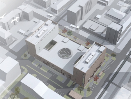 Публичная библиотека имеет простой геометрический объем и прямоугольную конфигурацию в плане, что позволяет деликатно вписаться в окружающую среду. Объемы, в которых находятся книгохранилища, имеют 9 этажей (учитывая подземный и технических этажи), объем, в который оснащен общественными, индивидуальными помещениями и разными функциями имеет 4 этажа (учитывая подземный этаж).