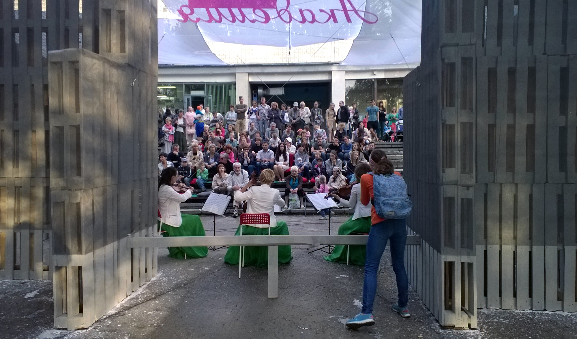 Конструкция летнего театра выполнена из европоддонов с последующей покраской фасадной краской. Конструкции закрыты москитной сеткой, что позволило сгладить их излишнюю брутальность, защитить стены от намокания и создать дополнительный декоративный эффект - муар. Защита от солнца выполнена с применением стоячего такелажа и бытовых тентов производства IKEA.