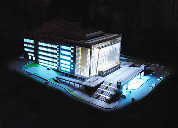 Существующий рельеф позволил разместить зал универсального назначения под вестибюлем главного зала так, что его основной фасад служит подпорной стеной, формирующей мощный стилобат с организованной на нем театральной площадью. Объем решен чистыми формами. рассчитан на восприятие с противоположного берега.
