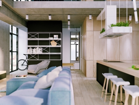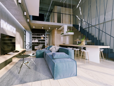 Двусветное пространство квартиры было решено оставить максимально открытым - все основные помещения квартиры представляют из себя единое целое и разделены только формально - шторами или мебелью.