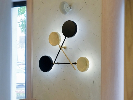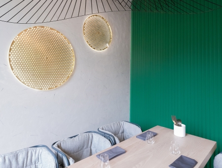Столы и стойка выполнены из бетонных и деревянных плит. Простота этих материалов делает их отличным фоном для красивых блюд. Ясень теплого цвета и латунные детали дополняют белые стены, делая интерьер уютным.