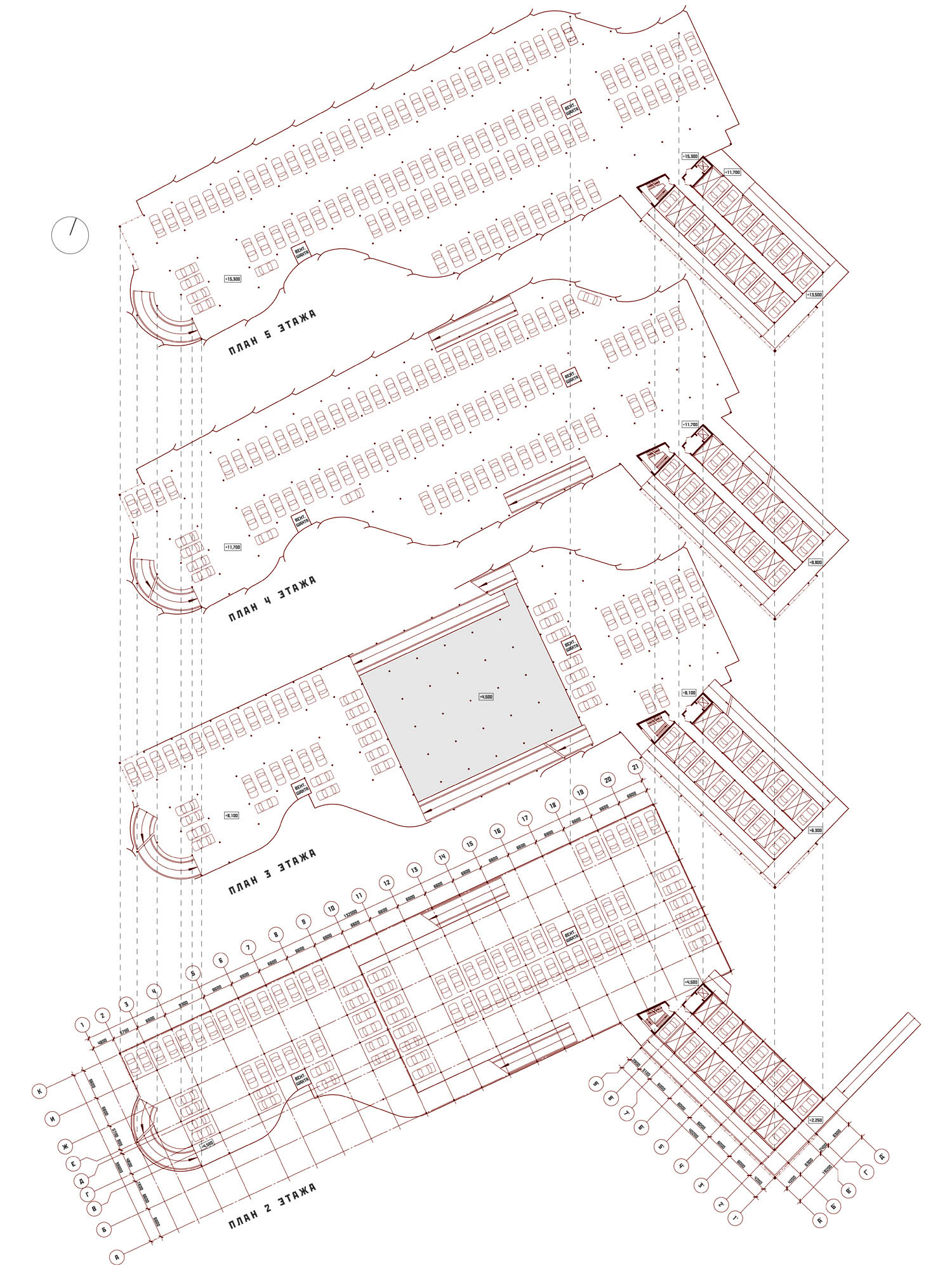 Рамповый гараж визуально разделён на два объёма открытым этажом. Фасады нижней части решены за счёт фактуры штукатурки и ритма деревянных реек. В верхней части узкие вертикальные окна расположены под углом к плоскости фасада и обособлены «чешуйками», которые формируют плавную линию фасада и создают интересный рисунок тени на плоскости фасада нижней части. Автоматизированная стоянка решена в виде более высокого прямоугольного объёма, по периметру которого размещена рампа. Фасады этого блока решены с помощью фотоэлектрических панелей.